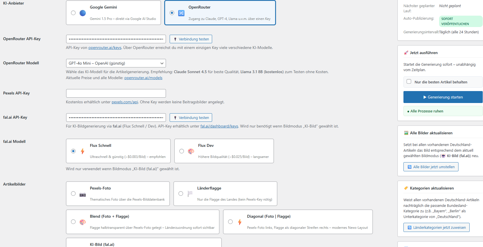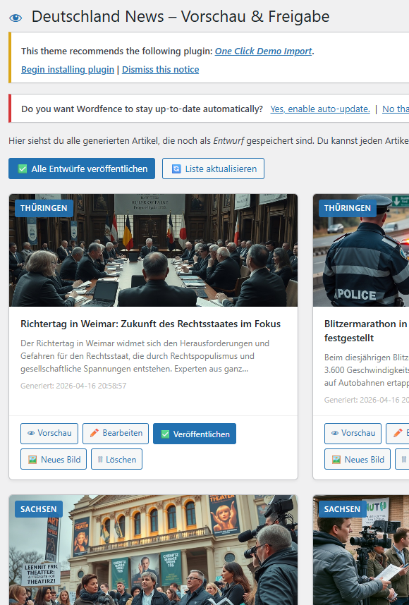 Der Deutschland News Generator holt stündlich aktuelle Nachrichten aus den wichtigsten deutschsprachigen Quellen – Spiegel, FAZ, ARD, ZEIT, Welt, DW und mehr – und verwandelt sie per künstlicher Intelligenz in eigenständige, professionell formulierte Blogartikel. Fertig formatiert, mit Beitragsbild, Kategorie und wahlweise sofort veröffentlicht.
